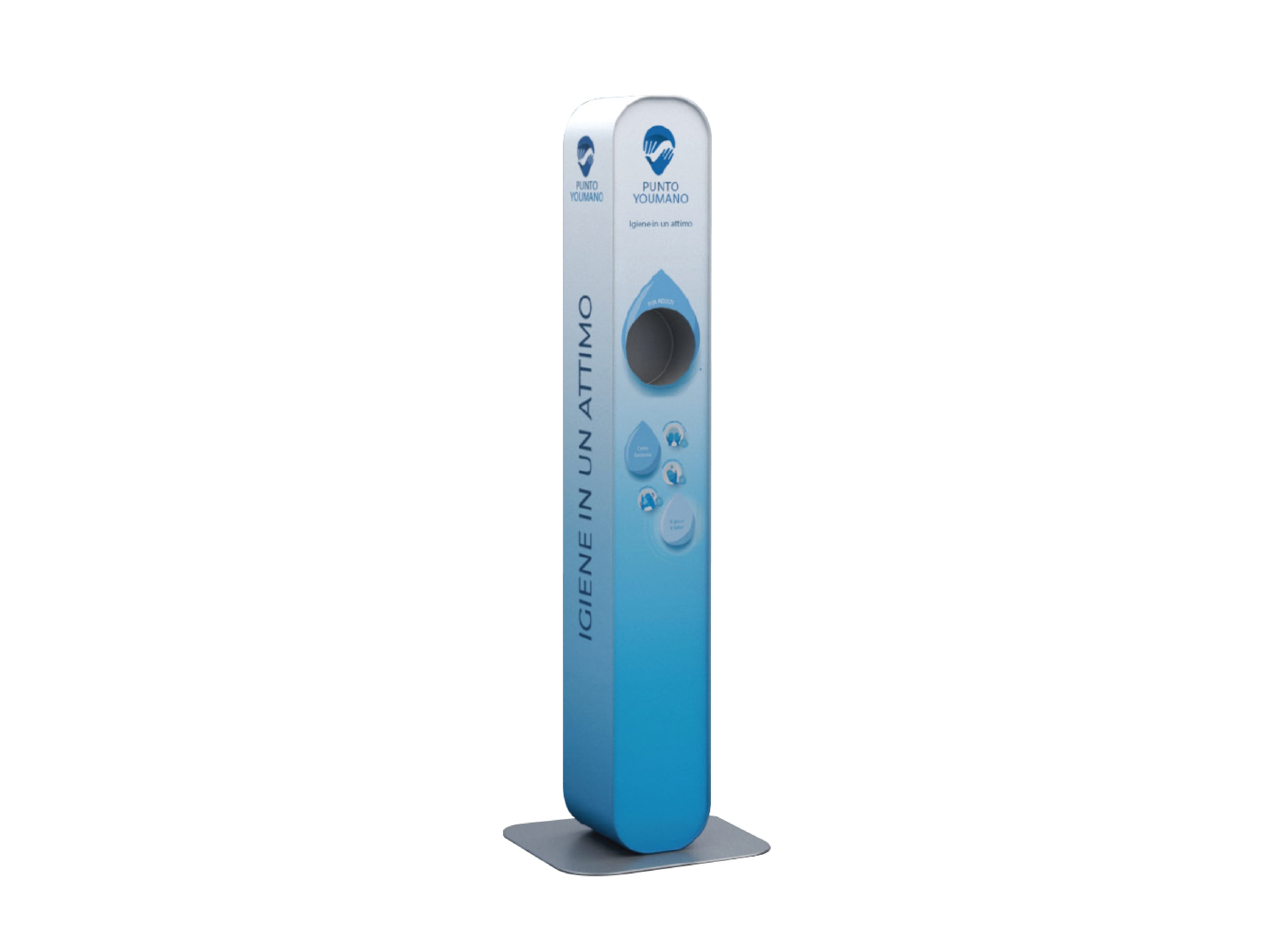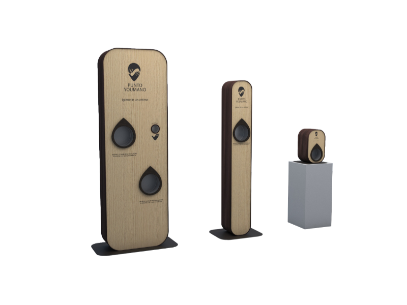 Punto YouMano offre un servizio ideale per ogni attività in cui è prevista la presenza di pubblico. Il Totem è stato pensato in tre versioni, studiate in rapporto ai diversi flussi delle persone. Le tre versioni si differenziano per dimensioni, numero di erogatori e quantità del gel disinfettante.
